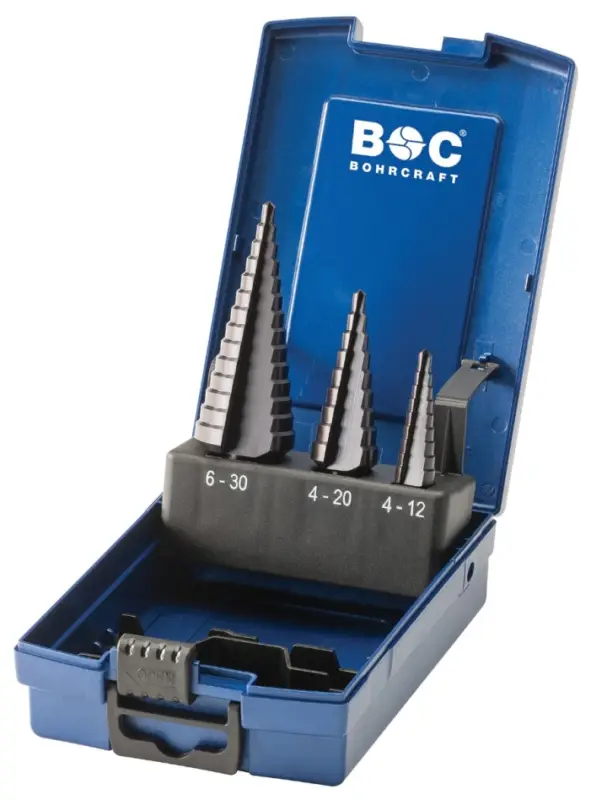 - Trappenboren uit massief, gehard HSS en geslepen volgens de zgn.