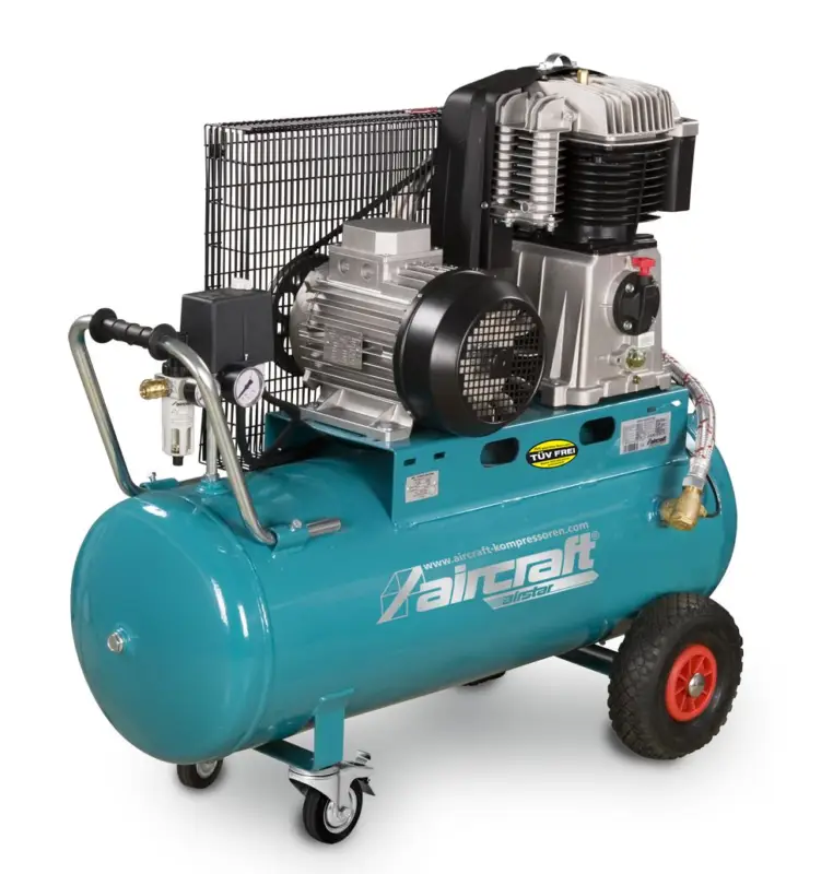 - Mobiele compressoren riemaandrijving 10 bar, 5,5 kW en 2-cilinder aggregaat met twee pistons, gietijzeren koelribben, met tank 100 liter voor de veeleisende professional.