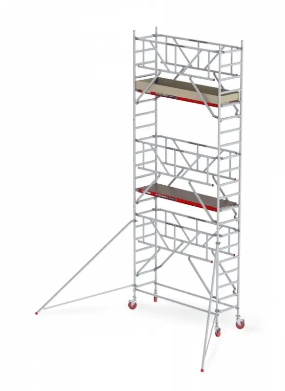 - Met smalle frames van 0,75 of 0,90 meter en een belasting tot 250 kg per platform is deze rolsteiger geschikt om in smalle ruimtes te plaatsen.
