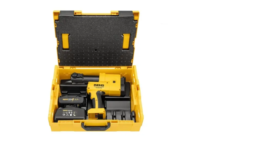 REMS Akku-Press 22V ACC Connected – universeel tot en met Ø 110 mm. Met connected-functionaliteit via wifi en oled-display. Selecteerbare ACC-modus. Persdrukmonitoring. Antitrillingssysteem. Automatische vergrendeling van de perstang. Elektrische bewaking van de gesloten stand van de tanghouderbout. Secondensnel, veilig persen. Spraakopnamen met spraakherkenning. Opstelling van rapporten met teksten en foto’s. Geolokalisatie van de perslocaties.